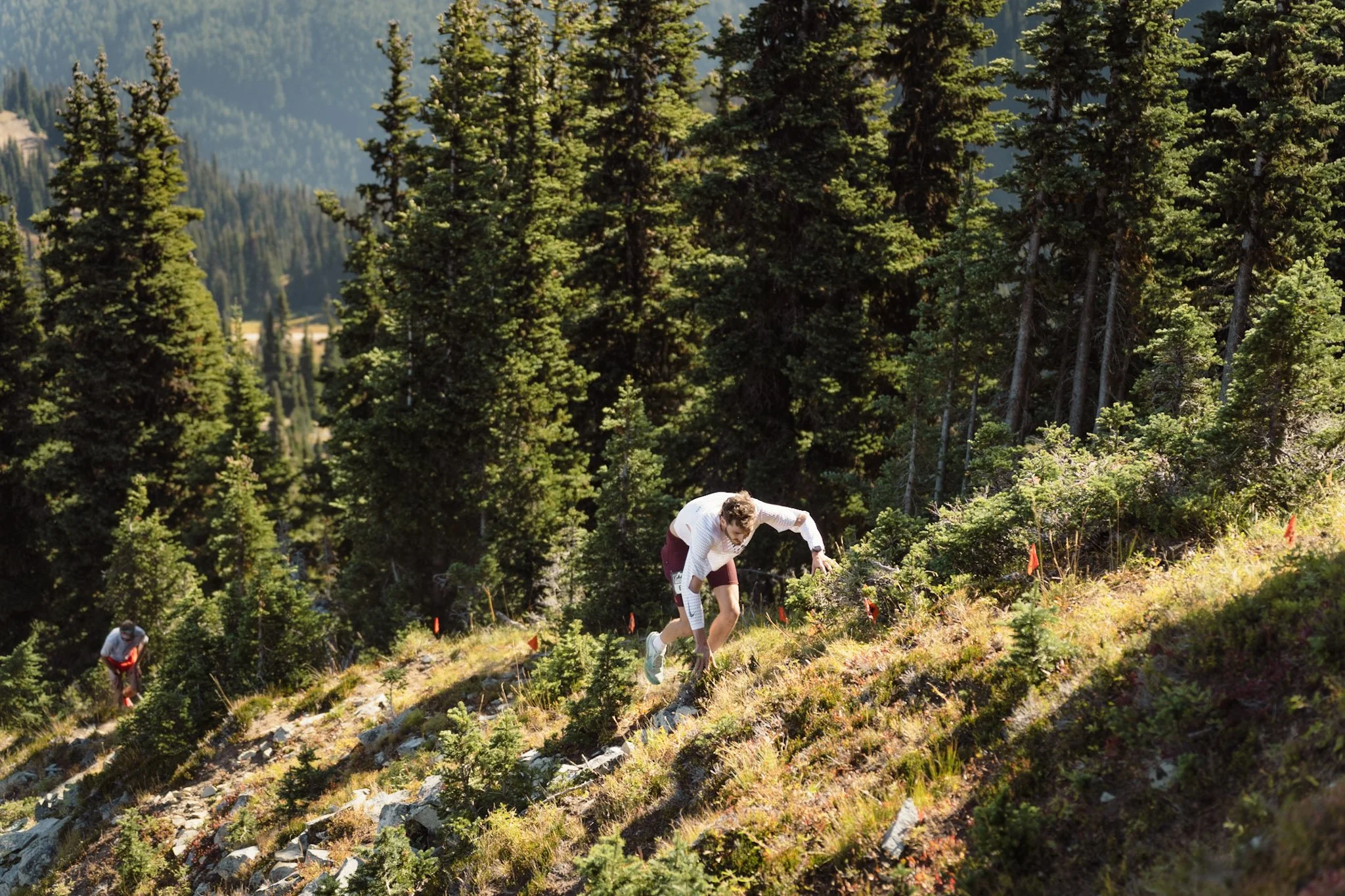 The course is the most direct route to the high alpine, it is steep, but intuitive, you will be pushing hard for the summit, putting yourself to your capacity, lungs, grit, and strength. Please note, we will have the course well marked, it is imperative, for your safety, you follow precise path of flagging. Please be mindful of other competitors, if you encounter an injured competitor please inform the nearest course Marshall, EMT or Crystal Mountain Patrol along the route. Course is well marked with orange flagging, if you suddenly find yourself on a path without immediate orange flags to indicate the route, please turn around, go back the way you came until you get back on trail with orange flags.