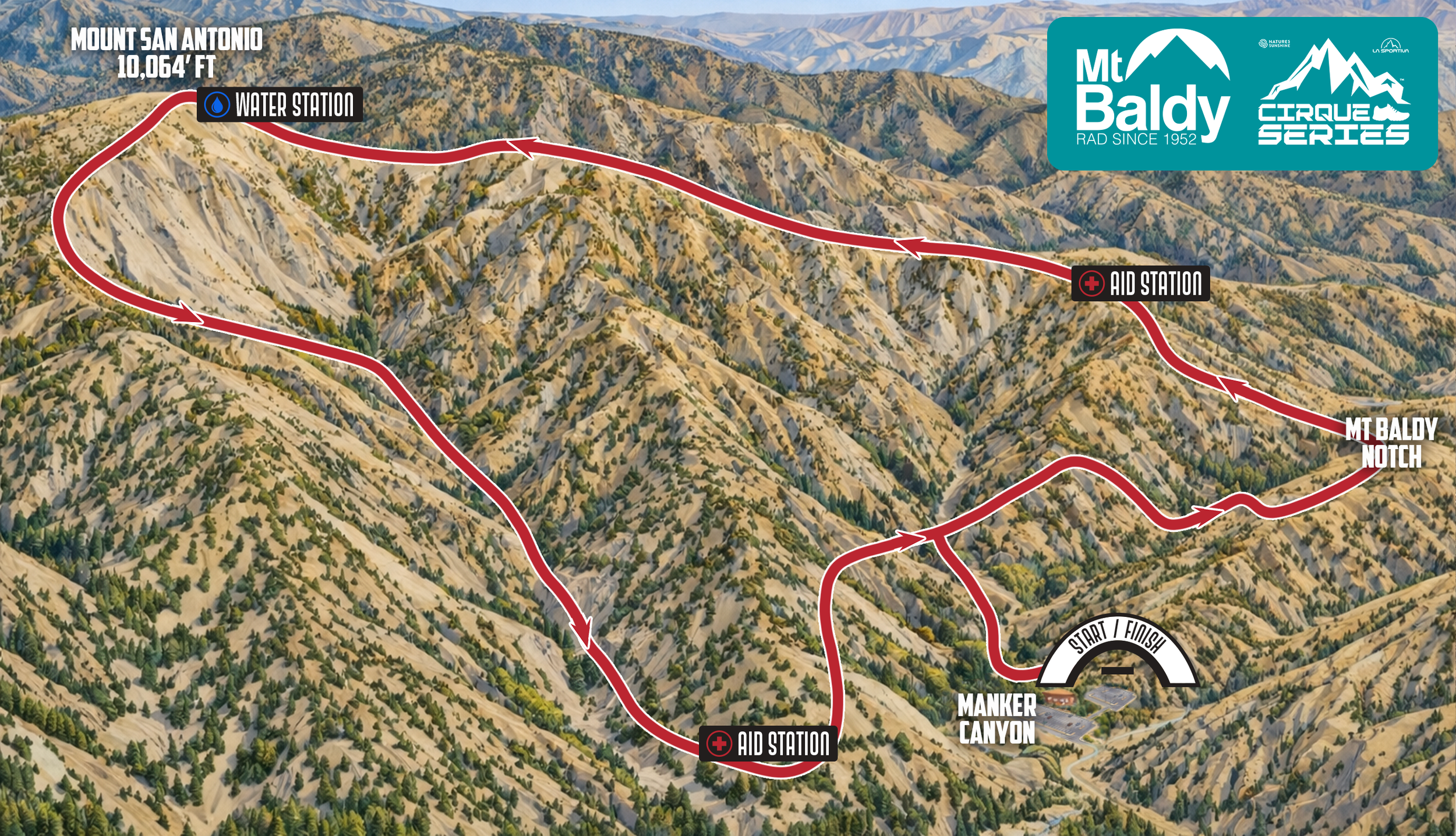 The finish line awaits back at the parking lot where the loop began — completing a true cirque route showcasing Baldy’s most iconic terrain: ridge, summit, bowl, forest, and mountain road. A course as beautiful as it is demanding — and unmistakably Mt. Baldy.